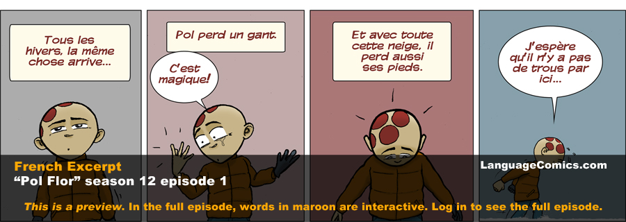 French ~ C’est l’hiver | It is Winter- S12e1 LanguageComics January 6, 2018 0 In this episode: It’s that season again. Text in maroon is clickable > Membership | >Video teaser ...{{{pf_fr_m}}}Full story visible to members only Log in or Become a member